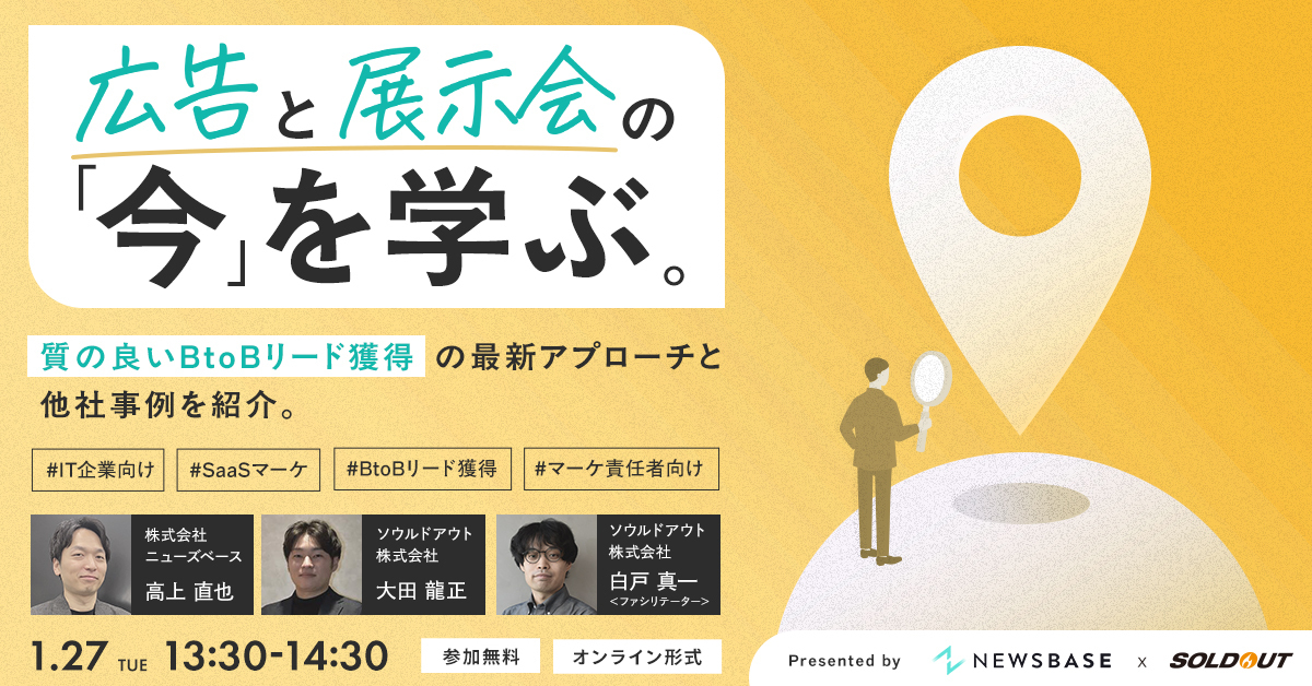 地方を含む全国の志ある中堅・中小企業の成長支援をデジタルマーケティング領域で展開するソウルドアウト株式会社(本社:東京都文京区 代表取締役社長CEO兼CCO:荒波 修、以下「ソウルドアウト」)は、2026年1月27日(火)にオンラインセミナー『広告と展示会の今を学ぶ。質のいいBtoBリード獲得の最新アプローチと他社事例』についてのセミナーを開催いたします。